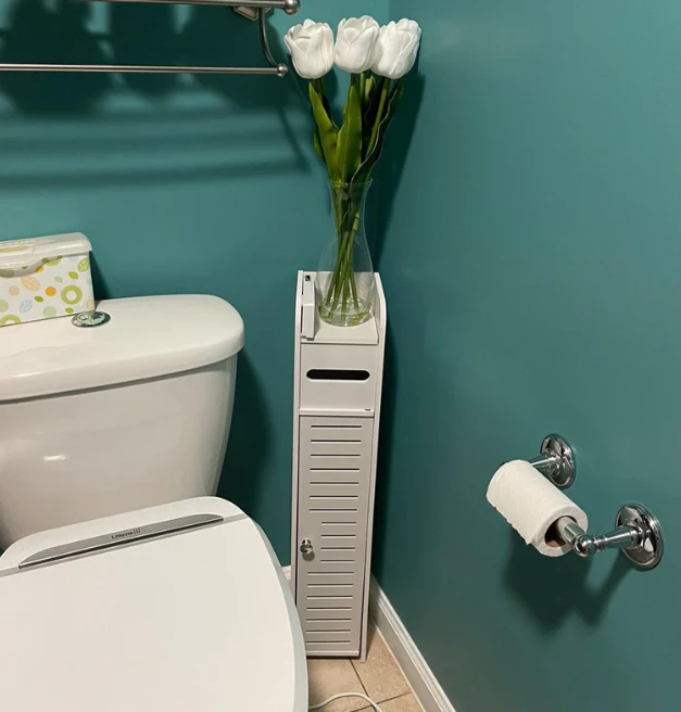 Modern bathroom furniture great for small spaces,easy to move or carry outside;Storage unit with doors and shelves,cut the right size to keep extra toilet paper and hand towels;great to put in the bathroom between the tub and the toilet.